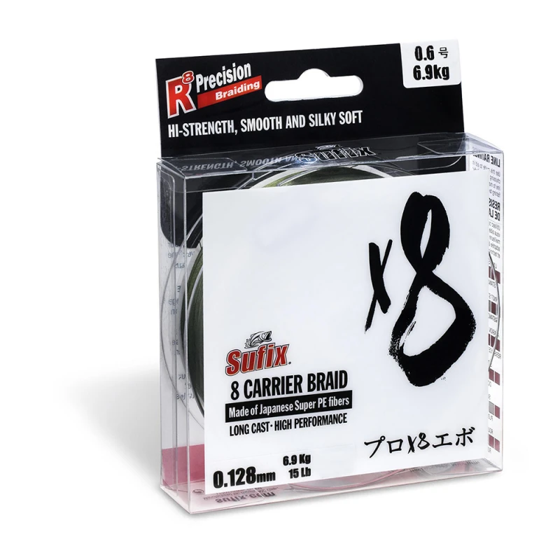 Die Sufix x8 ist eine runde, leicht zu handhabende und seidig-glatte geflochtene Schnur im japanischen Stil. Sie hat eine 8-Träger-Konstruktion aus dünnen HMPE-Fasern, die sie zu einer superstarken, dünnen Schnur mit hoher Abriebfestigkeit und hervorragender Knoten- und Stoßfestigkeit macht.Die R8-Präzisionsflechttechnologie mit einem hochfesten Flechtprozess verleiht dieser Schnur ihre ausgeprägten geschmeidigen und glatten Eigenschaften, die einen gleichbleibenden Durchmesser und eine gleichbleibende Qualität sowie ein hervorragendes Verhältnis von Festigkeit zu Durchmesser aufweisen.Die Materialien und die Konstruktion bedeuten, dass die Schnur eine geringe Reibung hat, wenn sie durch die Rutenführungen läuft. Dies führt zu einer leisen Performance und langen, präzisen Würfen.Die Sufix x8 ist sowohl für Wurf- als auch für Spinnrollen geeignet. Sie ist eine großartige Option für kleinere Köder, leichte Softplastics (Jigging), Barsch, Forelle, Regenbogenforelle und Finesse-Angeln.• 8-Träger-Konstruktion (dünne HMPE-Fasern)• R8 Precision Braiding Technologie• Runde und glatte geflochtene Schnur• Exzellentes Verhältnis von Stärke zu DurchmesserStärke:0.104mm 5,0kg0,128mm 6,9kg0,148mm 7,5kg0,165mm 10,5kg0,185mm 15,5kg0,205mm 17,5kg0,235mm 20kg0,285mm 22,5kg0,330mm 26,5kg
